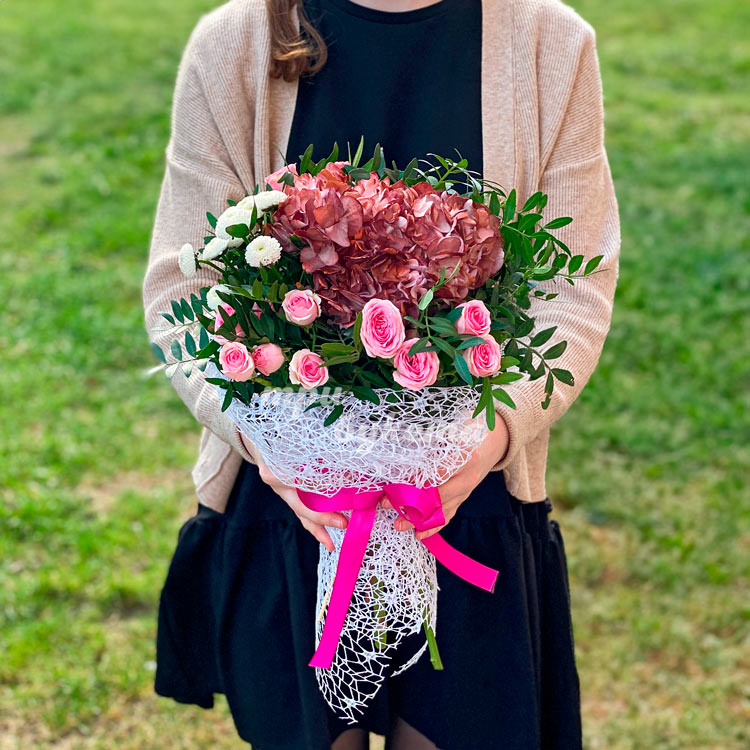 Бордовая гортензия с розовыми розами