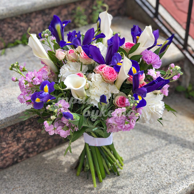 Букет из ирисов, гвоздик и маттиол