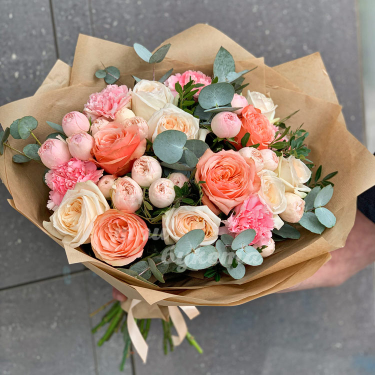Букет пионовидных роз с эвкалиптом