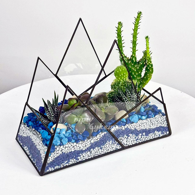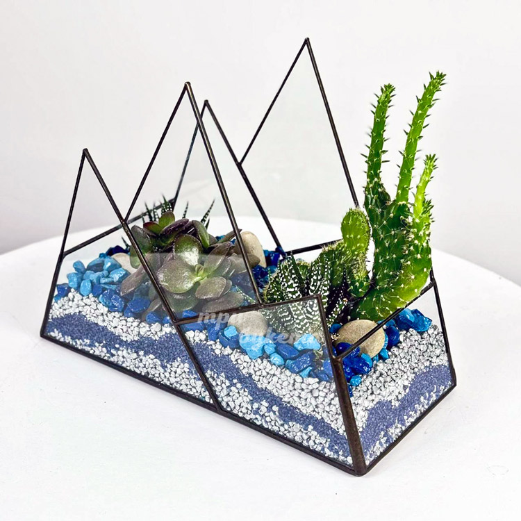 Флорариум с синими камешками, кактусами и суккулентами