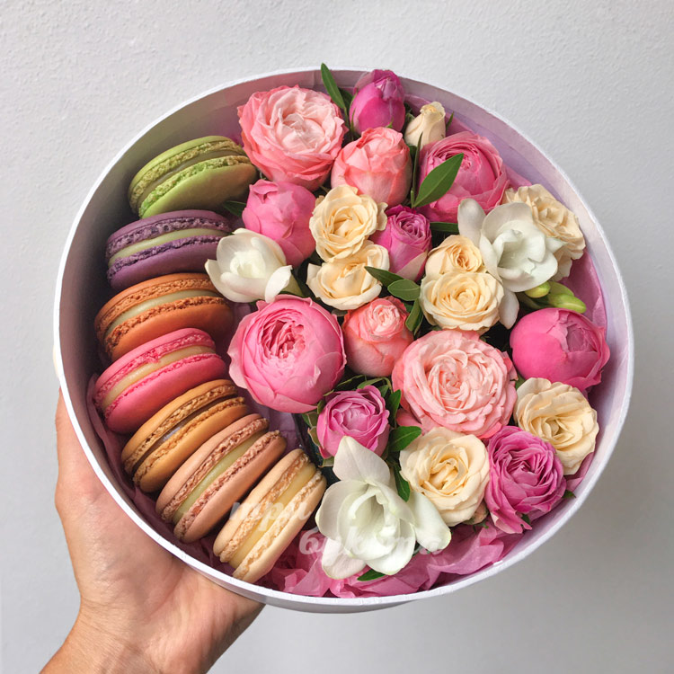 Фрезии и розы с макарунами в коробке