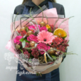 Герберы и хризантемы в розовом сизале