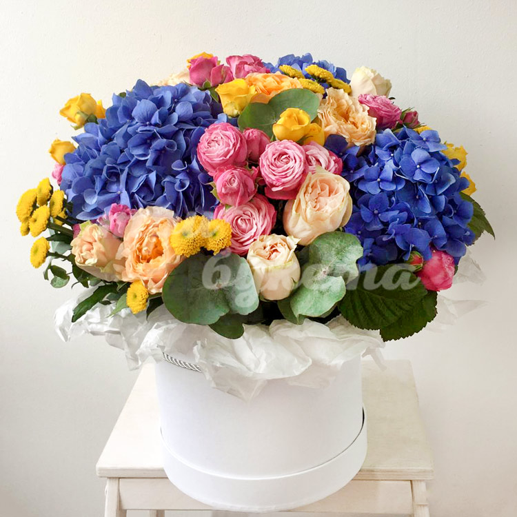 Гортензии и хризантемы в коробке