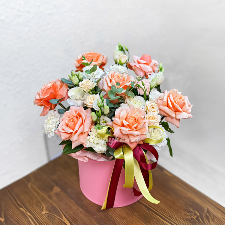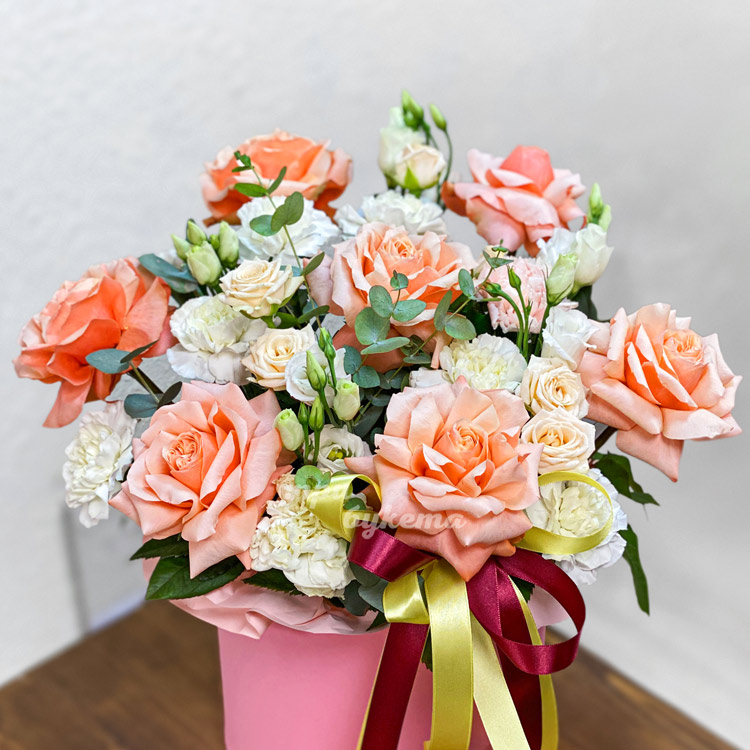 Коробка персиковых роз и белых гвоздик