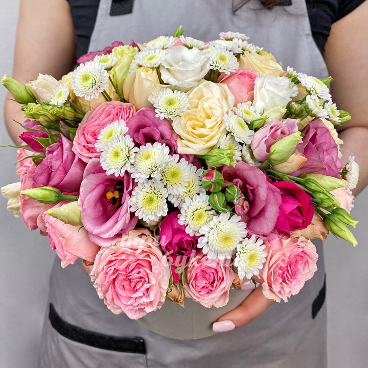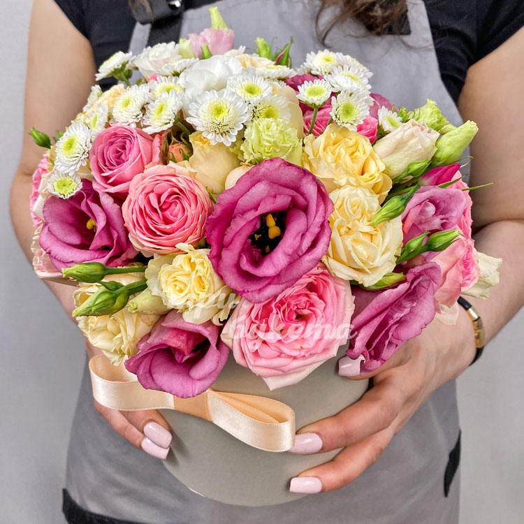 Пионовидные розы и эустомы в коробке