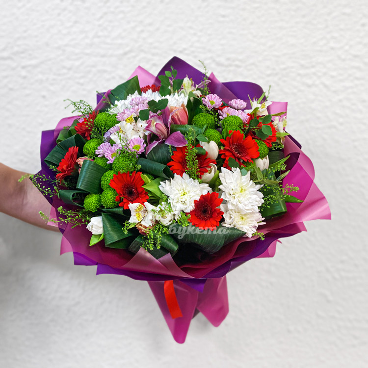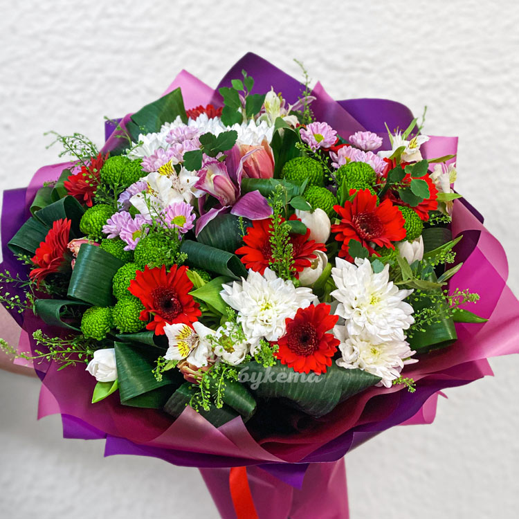 Яркий букет гербер, хризантем и тюльпанов